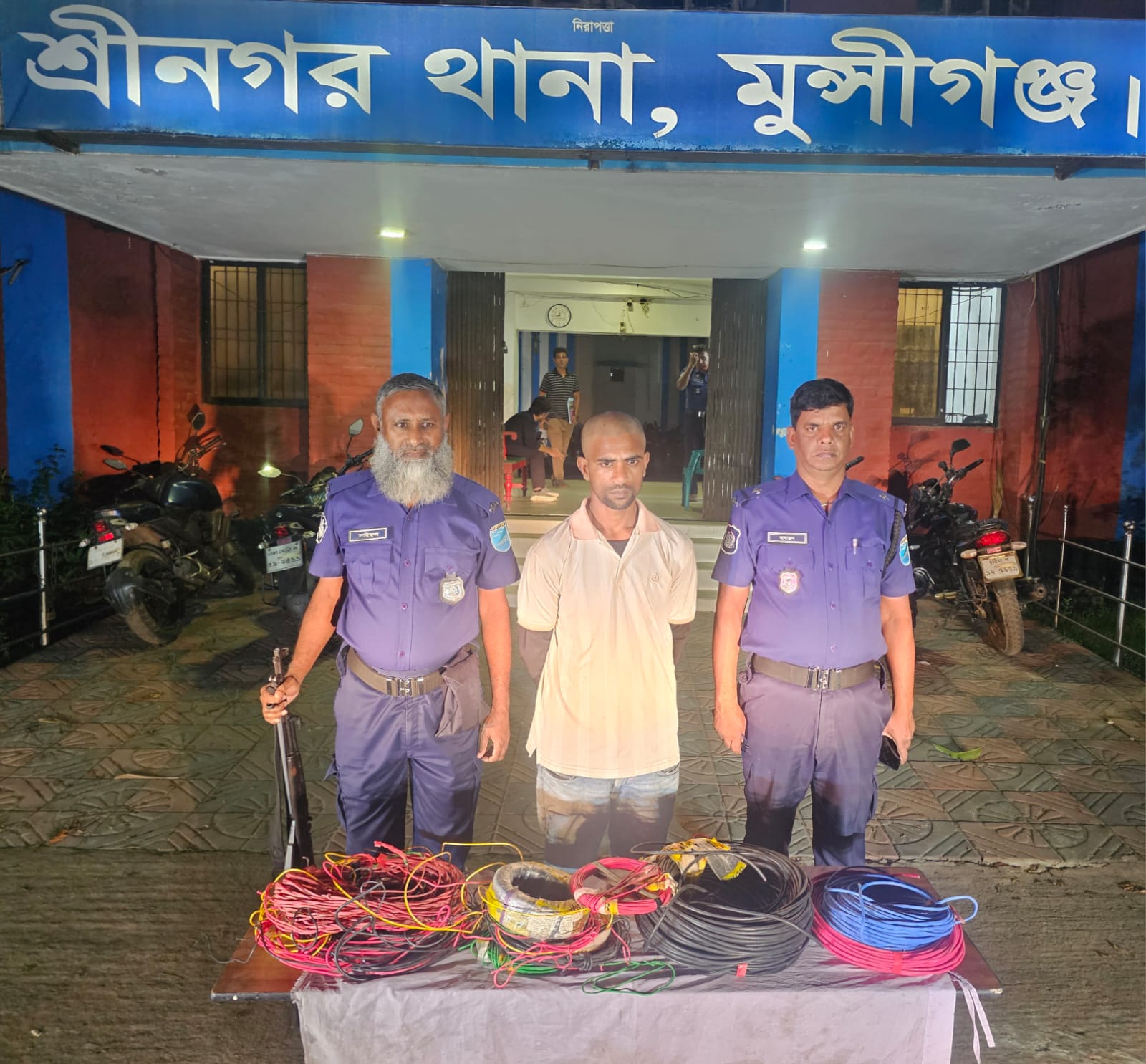 মুন্সীগঞ্জের শ্রীনগর উপজেলায় পুলিশের বিশেষ অভিযানে চোরাইকৃত বিপুল পরিমাণ বৈদ্যুতিক তারসহ এক তালিকাভুক্ত চোরকে গ্রেফতার করা হয়েছে।